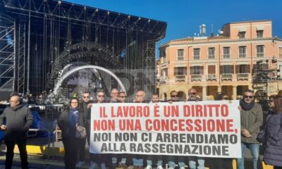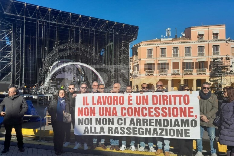 Sotto il palcoscenico in costruzione del Capodanno Rai in piazza Pitagora, si manifesta la protesta dei dipendenti della Abramo cc, il call center che ha annunciato...