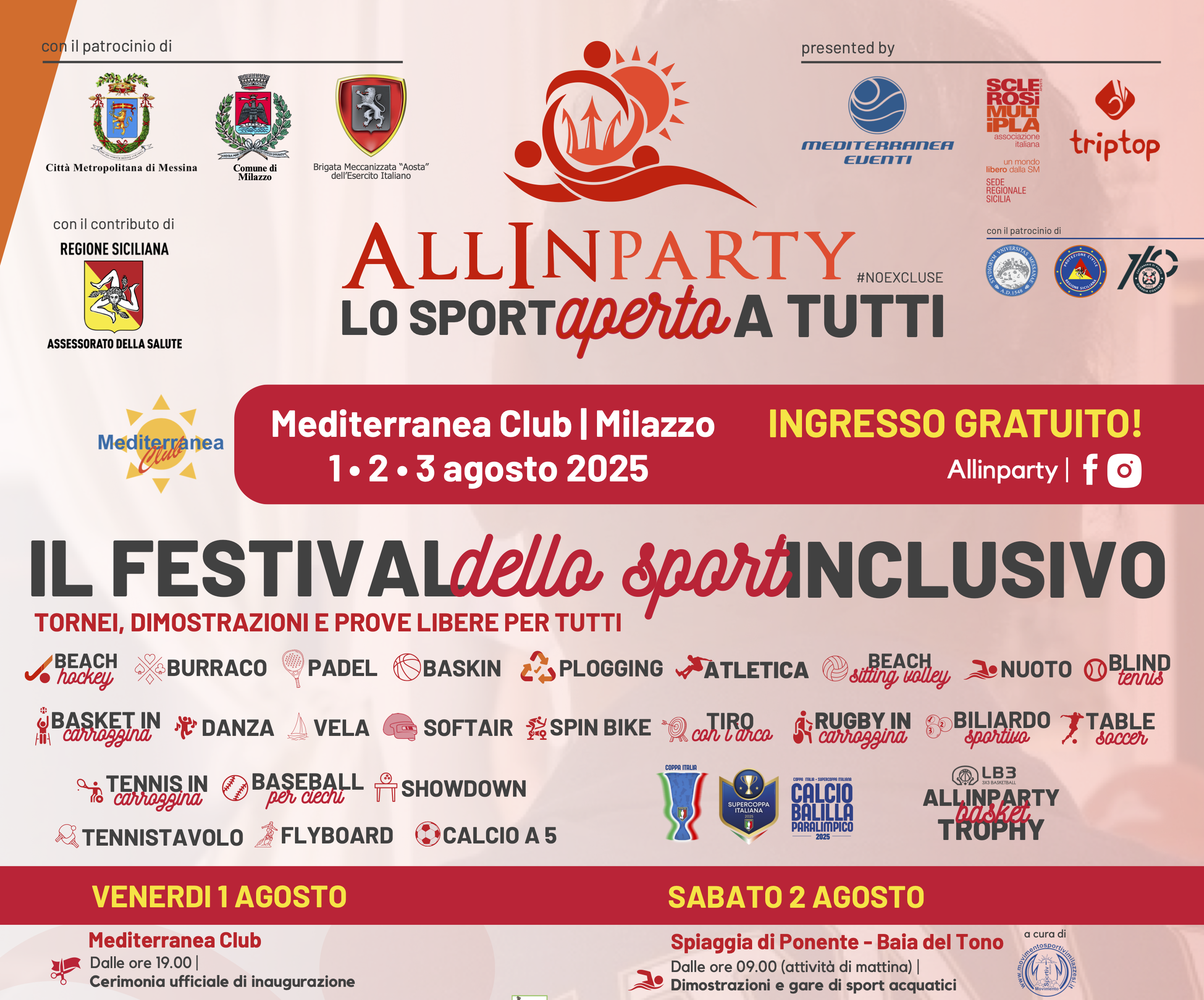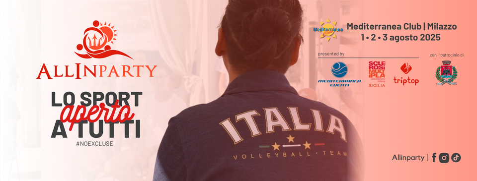 Tornei sportivi, dimostrazioni, stage e manifestazioni nazionali, aperti a tutti. Dopo una stagione di pausa, l’Allinparty è pronto a tornare in grande stile: Venerdi 1, sabato 2 e domenica 3 agosto 2025, il Mediterranea Club di Milazzo sarà nuovamente la casa della quinta edizione del “Festival dello sport inclusivo”, mega convention ideata e promossa da Mediterranea Eventi, Associazione Italiana Sclerosi Multipla e Triptop Tour Operator, con il patrocinio della Città Metropolitana di Messina, del Comune di Milazzo, della Brigata Meccanizzata “Aosta” dell’Esercito Italiano, dell’Università degli Studi di Messina e del Dipartimento Regione Sicilia della Protezione Civile, del Corpo delle Capitanerie di porto – Guardia Costiera, di molteplici Federazioni Sportive Nazionali ed il contributo dell’Assessorato della Salute della Regione Siciliana. Preziosissimo per la realizzazione della manifestazione, inoltre, il supporto di tanti Enti pubblici e privati e di tante associazioni sportive del territorio, la partecipazione e la collaborazione dei quali risulta fondamentale per la crescita dello spirito di sport, collaborazione e inclusione che promuove l’Allinparty.