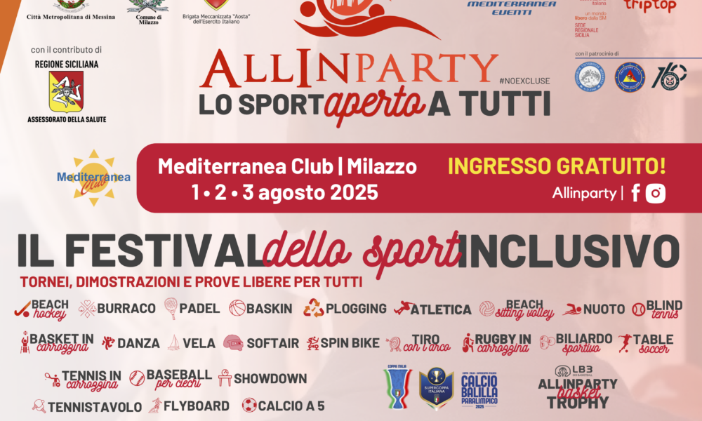 Lo sport come motore di inclusione. Al Mediterranea Club di Milazzo, torna Allinparty, il “Festival dello sport inclusivo” Tornei sportivi, dimostrazioni, stage e manifestazioni nazionali, aperti...